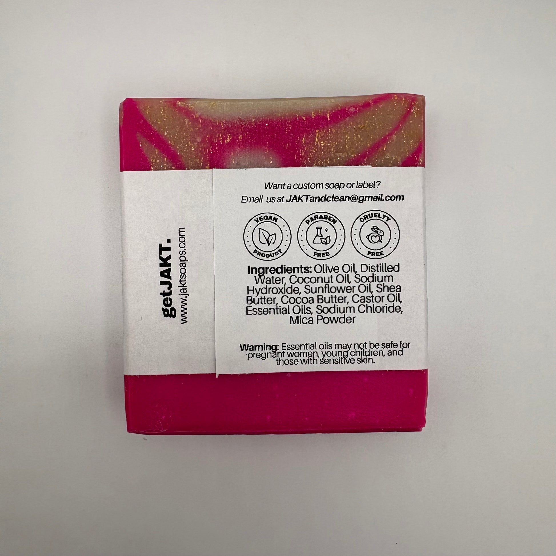 Ingredients: Olive Oil, Distilled Water, Coconut Oil, Sodium Hydroxide, Sunflower Oil, Shea Butter, Cocoa Butter, Castor Oil, Essential Oils, Sodium Chloride, Mica Powder.