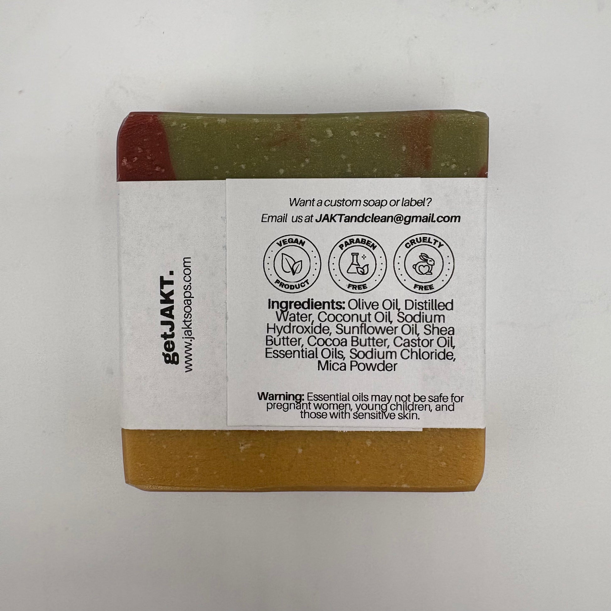 Ingredients: Olive Oil, Distilled Water, Coconut Oil, Sodium Hydroxide, Sunflower Oil, Shea Butter, Cocoa Butter, Castor Oil, Essential Oils, Sodium Chloride, Mica Powder.