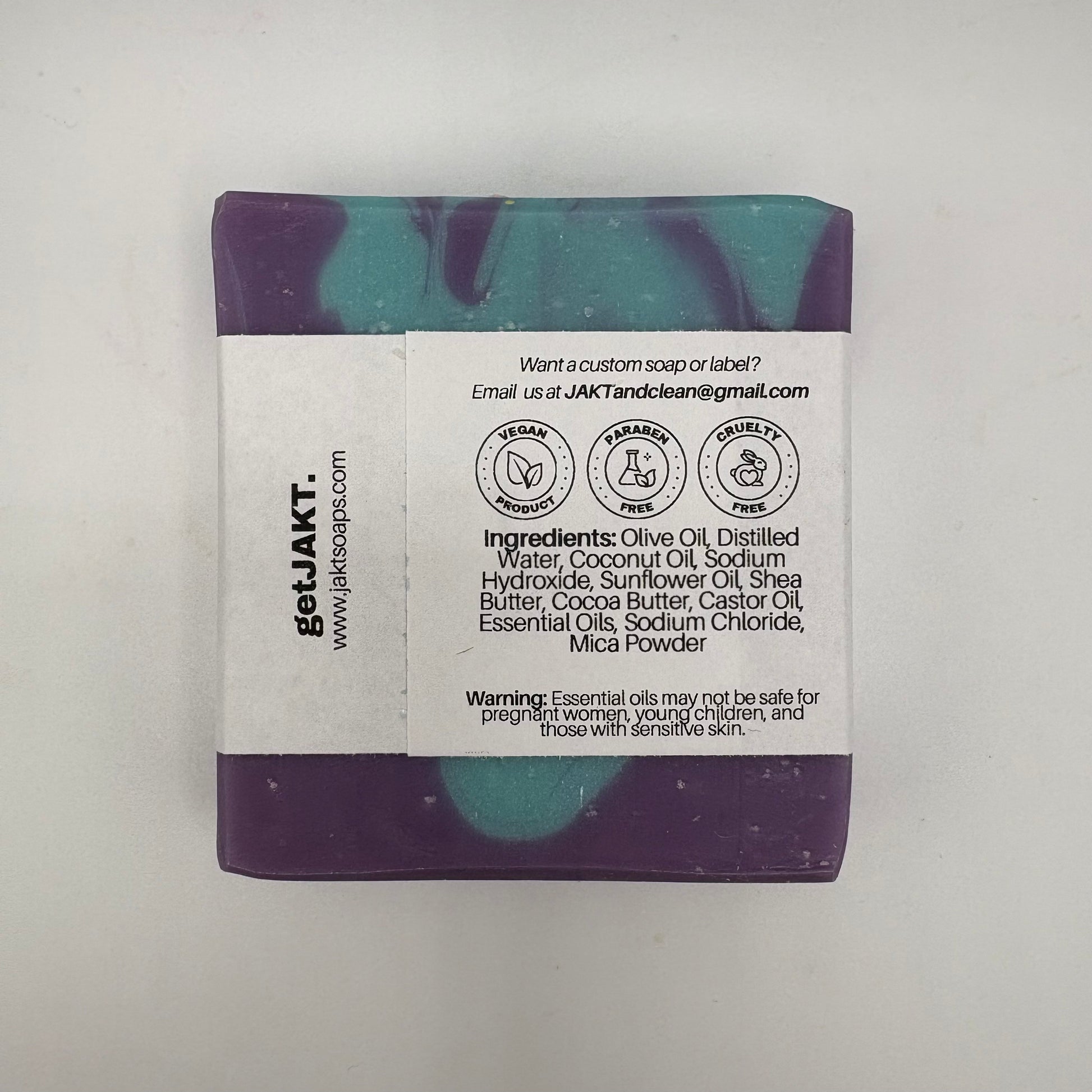 Ingredients: Olive Oil, Distilled Water, Coconut Oil, Sodium Hydroxide, Sunflower Oil, Shea Butter, Cocoa Butter, Castor Oil, Essential Oils, Sodium Chloride, Mica Powder.