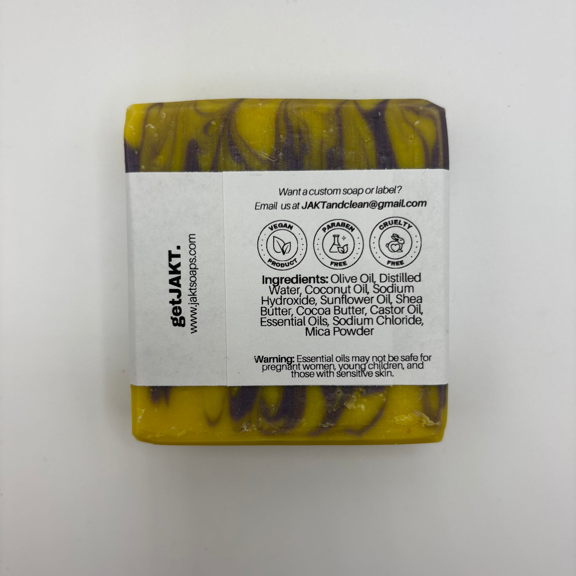 Ingredients: Olive Oil, Distilled Water, Coconut Oil, Sodium Hydroxide, Sunflower Oil, Shea Butter, Cocoa Butter, Castor Oil, Essential Oils, Sodium Chloride, Mica Powder.