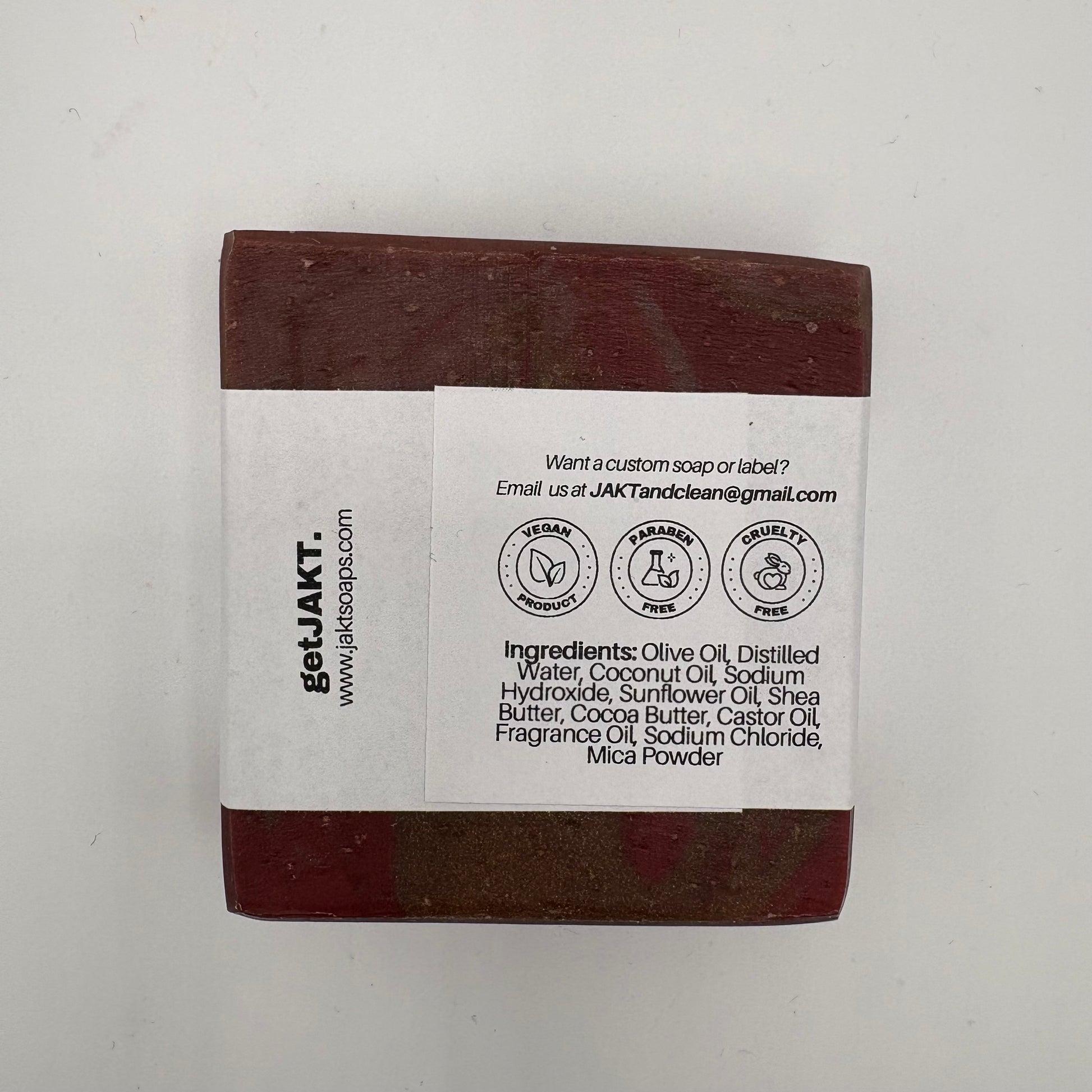 Ingredients: Olive Oil, Distilled Water, Coconut Oil, Sodium Hydroxide, Sunflower Oil, Shea Butter, Cocoa Butter, Castor Oil, Fragrance Oil, Sodium Chloride, Mica Powder.