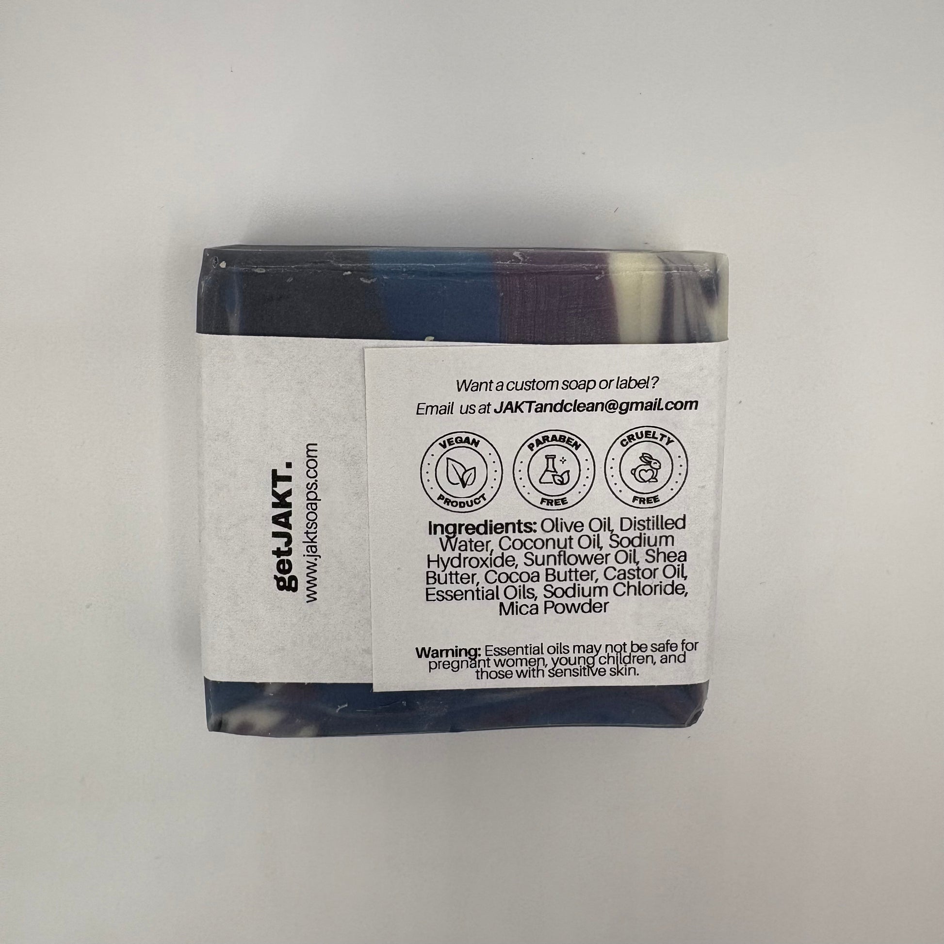 Ingredients: Olive Oil, Distilled Water, Coconut Oil, Sodium Hydroxide, Sunflower Oil, Shea Butter, Cocoa Butter, Castor Oil, Essential Oils, Sodium Chloride, Mica Powder.